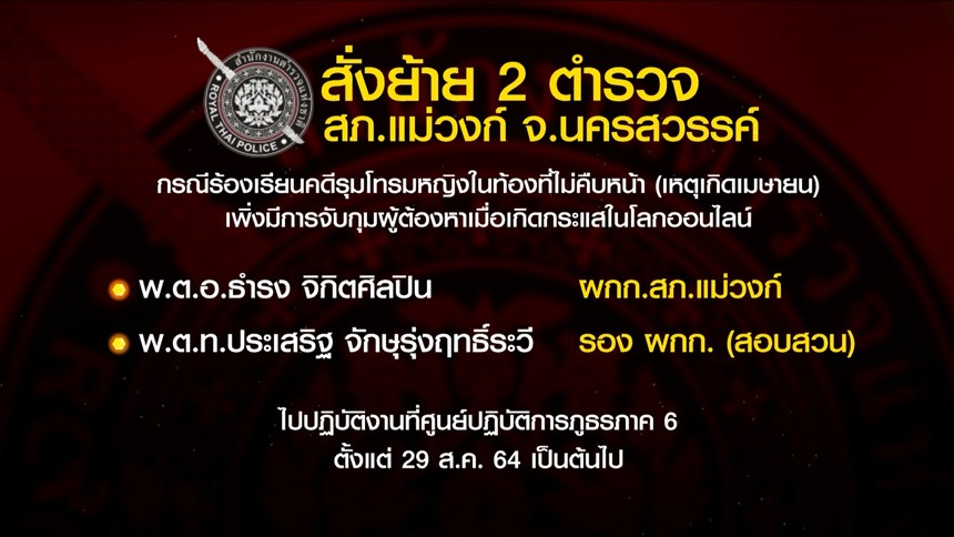 ต่อมาวานนี้ (29 ส.ค.) พล.ต.ท.อภิชาติ ศิริสิทธิ์ ผู้บัญชาการตำรวจภูธรภาค 6 ลงนามในคำสั่งตำรวจภูธรภาค 6 ให้พ.ต.อ.ธำรง จิกิตศิลปิน ผู้กำกับการสถานีตำรวจภูธรแม่วงก์ จังหวัดนครสวรรค์ และพ.ต.ท.ประเสริฐ จักษุรุ่งฤทธิ์ระวี รองผู้กำกับการ (สอบสวน) สถานีตำรวจภูธรแม่วงก์ จังหวัดนครสวรรค์ ปฏิบัติราชการที่ศูนย์ปฏิบัติการตำรวจภูธรภาค 6