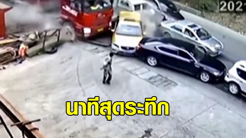 หนุ่มจีนไหวตัวทัน วิ่งหนีออกจากรถ ก่อนรถบรรทุกจะวิ่งเข้ามาชนระนาว