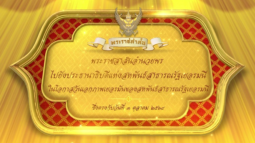 วันนี้ พระบาทสมเด็จพระเจ้าอยู่หัว ทรงพระกรุณาโปรดเกล้าโปรดกระหม่อม ให้ส่งข้อความพระราชสาส์นอำนวยพร ไปยังประธานาธิบดีแห่งสหพันธ์สาธารณรัฐเยอรมนี ในโอกาสวันเอกภาพเยอรมัน ของสหพันธ์สาธารณรัฐเยอรมนี ซึ่งตรงกับวันที่ 3 ตุลาคม 2564 ความว่า
