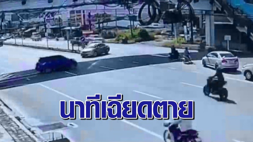 คลิปจากกล้องวงจรปิดใกล้จุด ซึ่งบันทึกวินาทีชีวิตขณะเกิดอุบัติเหตุเหตุรถจักรยานยนต์ ชนรถเก๋งล้มคว่ำร่างกระเด็นไถลไปกับรถจักรยานยนต์