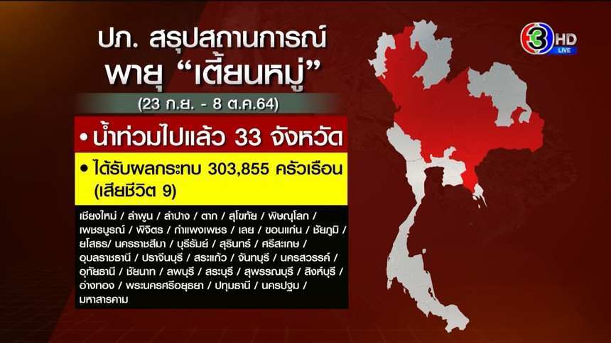 และ ใน 33 จังหวัดขระนี้มีประชาชนได้รับผลกระทบแล้ว 303,855 ครัวเรือน ผู้เสียชีวิต อยู่ที่ 9 คน ส่วนจังหวัดที่สถานการณ์คลี่คลายแล้วอยู่ที่ 16 จังหวัด เหลืออีก 17จังหวัด ยังมีปัญหาน้ำท่วมขัง