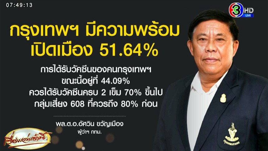 อย่างไรก็ตาม จากชุดข้อมูลของคณะกรรมการวิชาการประเมินความพร้อมในการเปิดพื้นที่ระบุว่ากรุงเทพฯ มีความพร้อม 51.64% พิจารณาจากความก้าวหน้าในการได้รับวัคซีนของคนกรุงเทพฯ ขณะนี้อยู่ที่ 44.09% ควรได้รับวัคซีนครบ 2 เข็ม 70% ขึ้นไป โดยเฉพาะในกลุ่มเสี่ยง 608 ที่ควรถึง 80% ก่อน อีกทั้งยังต้องมีการหารือเพิ่มเติมถึงมาตรการและเงื่อนไขที่ชัดเจน จึงจะกำหนดเป้าหมายวันเปิดเมืองพร้อมวางไทม์ไลน์ให้ทุกฝ่ายได้เตรียมพร้อมที่สุด ในการเปิดเมืองครั้งนี้ โดยจะมีการนัดประชุมหารือกันต่อไป