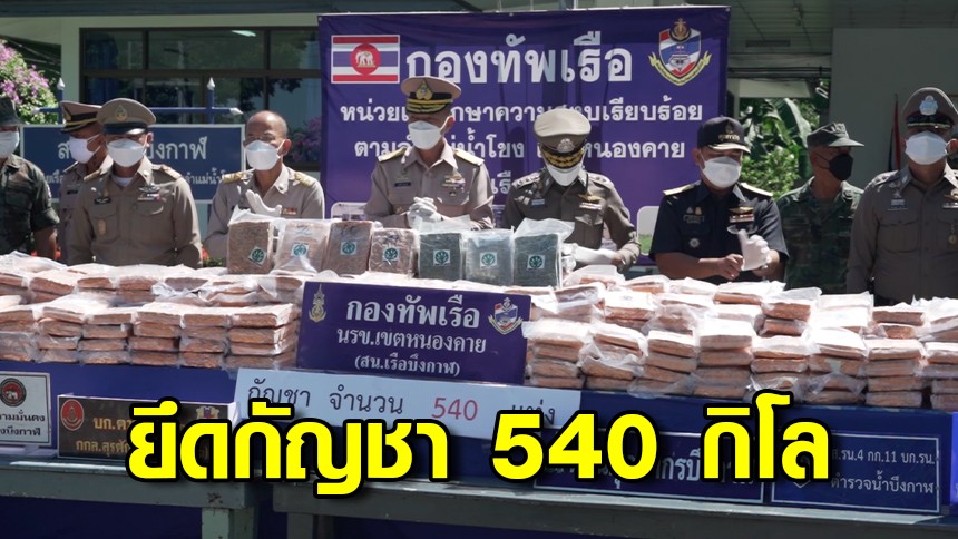 วันที่ 4 ต.ค. ที่สถานีเรือบึงกาฬ (นรข.บึงกาฬ) อ.เมืองบึงกาฬ จ.บึงกาฬ พล.ร.ต.สมบัติ จูถนอม ผบ.นรข. , นายนายธาตรี บุญมาก รอง ผวจ.บึงกาฬ , พล.ต.ต.ธรรมจักร คงมงคล ผบก.ภ.จว.บึงกาฬ และน.อ.ราฆพ เทวะประทีป ผบ.นรข.เขตหนองคาย พร้อมหน่วยงานที่เกี่ยวข้องร่วมกันแถลงข่าวผลการตรวจยึดกัญชาแห้งอัดแท่ง จำนวน 540 แท่ง น้ำหนักประมาณ 540 กิโลกรัม หุ้มฟอยล์สีทองแดง เกรดพรีเมียม ติดโลโก้รูปใบกัญชาในวงกลมสีเขียว พร้อมตัวหนังสือภาษาอังกฤษ MADE IN LAO และสัญลักษณ์รูปธงชาติลาว มูลค่ากว่า 16 ล้านบาท