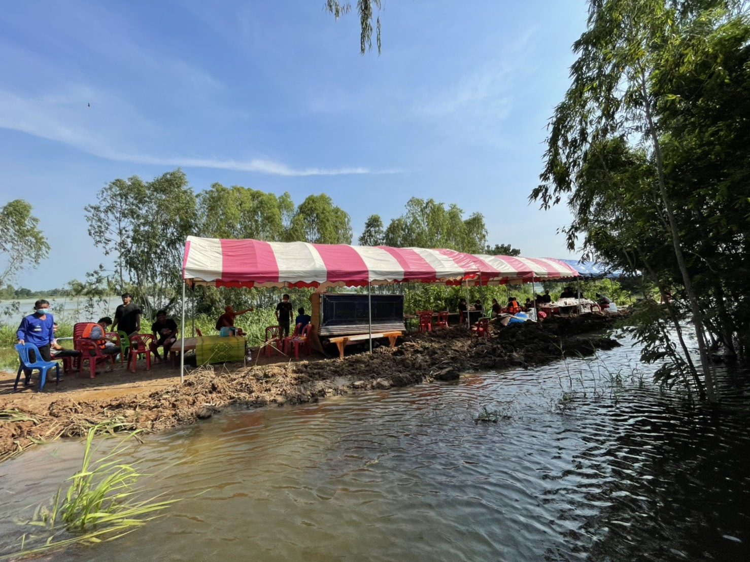หลังตั้งศพไว้ในเต็นท์อพยพสวดเพียง 1 คืน เดิมจะตั้งสวด 3 คืน แต่เนื่องจากน้ำท่วมสูง หวั่นคันดินจุดตั้งศพแตก จึงตัดสินใจเคลื่อนศพไปเผาทันที โดยแม่ผู้ตายนั่งร้องไห้จับโลงศพลูกชายอยู่บนเรืออย่างโศกเศร้า พร้อมทั้งนิมนต์พระสงฆ์ 1 รูป นั่งมากับเรือ