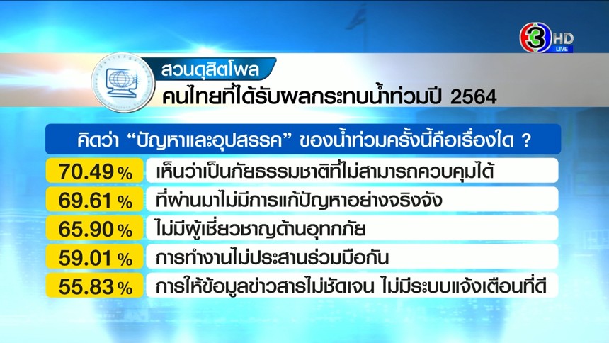 1.คิดว่า “ปัญหาและอุปสรรค” ของน้ำท่วมครั้งนี้คือเรื่องใด เห็นว่าเป็นภัยธรรมชาติที่ไม่สามารถควบคุมได้ 70.49% ที่ผ่านมาไม่มีการแก้ปัญหาอย่างจริงจัง 69.61% ไม่มีผู้เชี่ยวชาญด้านอุทกภัย 65.90% การทำงานไม่ประสานร่วมมือกัน 59.01% การให้ข้อมูลข่าวสารไม่ชัดเจน ไม่มีระบบแจ้งเตือนที่ดี 55.83%