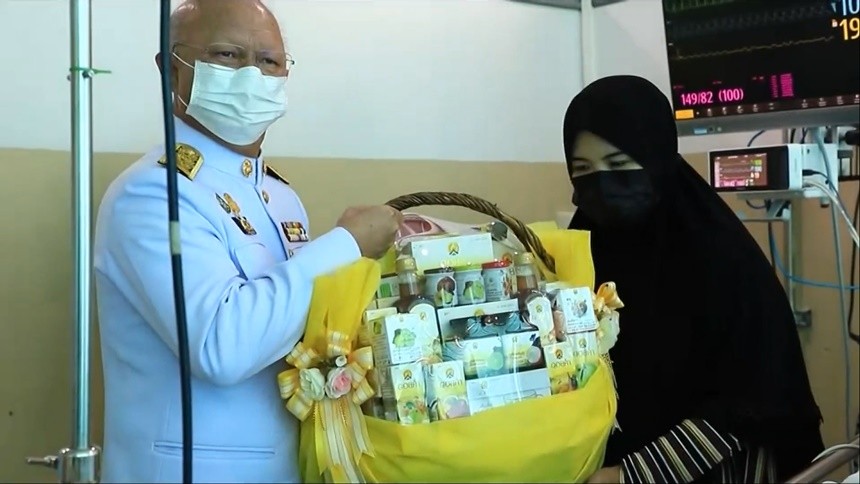 ผู้ว่าราชการจังหวัดยะลา เชิญดอกไม้ และตะกร้าสิ่งของพระราชทาน ไปมอบแก่เจ้าหน้าที่ ที่ได้รับบาดเจ็บ จากสถานการณ์ความไม่สงบในพื้นที่