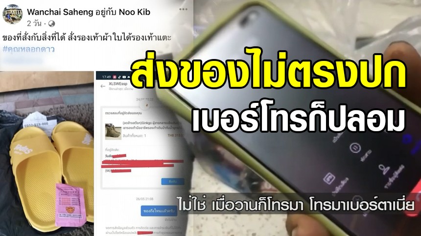 ผู้ใช้เฟซบุ๊ก Wanchai Saheng ได้โพสต์ข้อความว่า ของที่สั่งกับสิ่งที่ได้ สั่งรอฃเท้าผ้าใบได้รองเท้าแตะ คุณหลอกดาว พร้อมกับรูปรองเท้าผ้าใบหุ้มข้อและรองเท้าแตะสีเหลือง เปรียบเทียบกันหลังจากที่มีการโพสต์ลงเฟซบุ๊กได้มีผู้เข้ามาคอมเม้นและกดแชร์จำนวนมาก