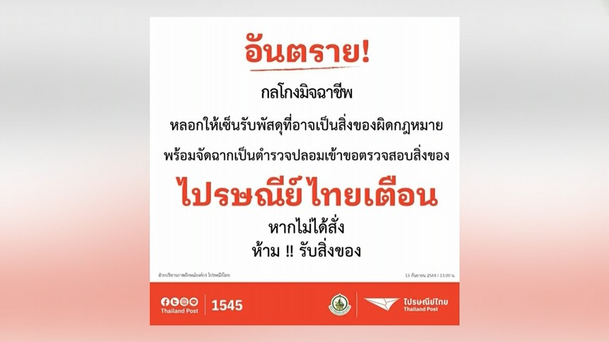 ไปรษณีย์ไทย เตือนภัย! อย่าเซ็นรับพัสดุที่ไมได้สั่ง อาจเจอแก๊งจัดฉาก ตร.ปลอมจับสิ่งผิด กม.