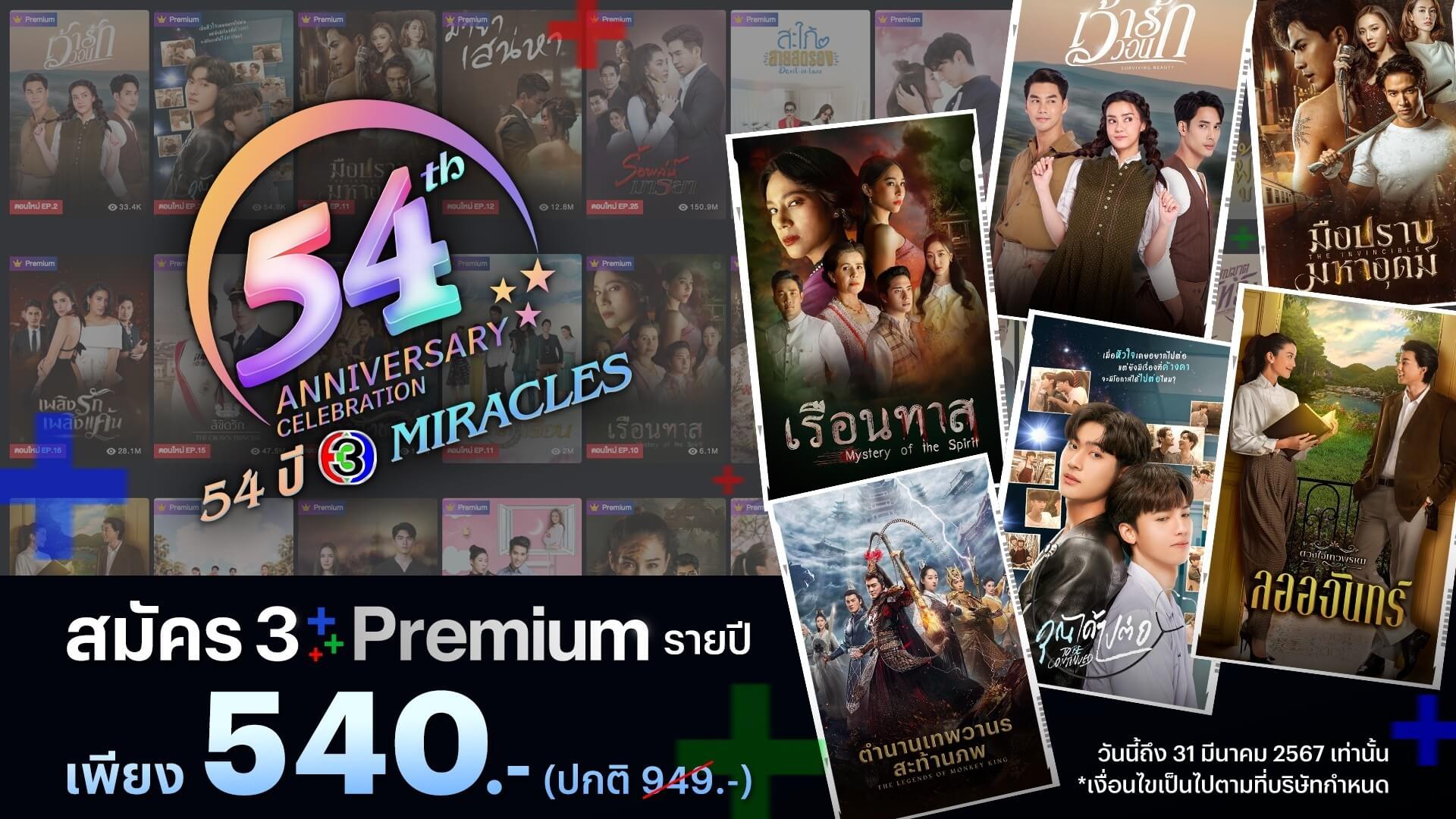 3Plus ร่วมฉลอง 54 ปี ช่อง 3 จัดโปรโมชันสุดคุ้มสำหรับสมาชิก 3Plus Premium เติมเต็มความบันเทิงจนล้นไม่ว่าจะดูละครย้อนหลังได้ก่อนใคร แบบ Full EP ไม่มีโฆษณาคั่น กิจกรรมสุด special ที่จะเสิร์ฟความพิเศษแบบตรงใจให้คุณได้ฟินขั้นสุด การแชร์โมเมนต์สุดประทับใจกับนักแสดง-ศิลปินช่อง 3 อย่างใกล้ชิด พร้อมสิทธิเข้าถึง Exclusive Clip ทั้งเบื้องหน้า เบื้องหลังแบบอินไซด์ที่จะทำให้คุณรู้สึกเหมือนนั่งอยู่ในเหตุการณ์ สมัครสมาชิก 3Plus Premium แบบรายปีในราคาพิเศษเพียง 540 บาท!!! (จากราคาปกติ 949 บาท/ปี) โปรโมชันนี้สามารถสมัครได้ตั้งแต่วันที่ 1 มีนาคม 2567 เวลา 12.00 น. - 31 มีนาคม 2567 ทาง 3Plus เท่านั้นนะ พร้อมความพิเศษ 3 ต่อ