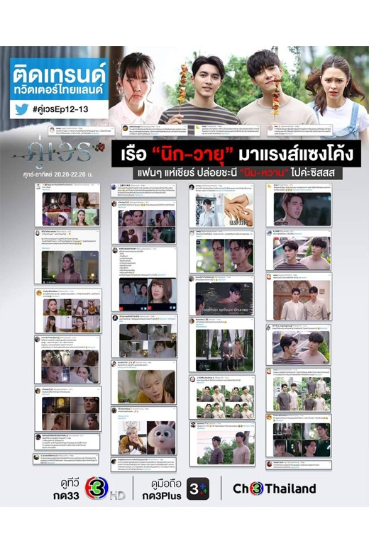 แต่การแต่งงานของบีมกับบอสฉัตรทอง ไม่ได้ทำให้นิกเจ็บปวดอย่างสาหัสเพียงคนเดียว เพราะยังมี หวาน (โม มนชนก) ที่ทั้งโมโห เสียใจ และรู้สึกพ่ายแพ้บีมทุกอย่าง บีมได้ทั้งคนรักที่ดี ชีวิตดีต่างกับหวานที่ต้องพยายามอย่างหนักเพื่อที่จะได้ทุกสิ่งมา ส่วนวายุ (ก็อต อิทธิพัทธ์) ตั้งแต่เหตุการณ์ที่หวาน พังชีวิตความรักของเขากับบีม ก็กลายเป็นหนุ่มหล่อทรงเกาหลีเกาใจผู้แสนดีคอยอยู่ข้างๆ ให้กำลังใจ นิกตลอด จนคนดูแห่จิ้นคู่ “นิก-วายุ” ให้คู่กันตอนจบได้ไหม ปล่อยชะนี “บีม-หวาน” ไปเถอะเพราะมันปวดหัว ด้วยกระแสเหล่านี้จากชาวโซเชียลส่งผลให้ #คู่เวรEp12 และ #คู่เวรEp13 ติดเทรนด์ทวิตเตอร์ไทยแลนด์