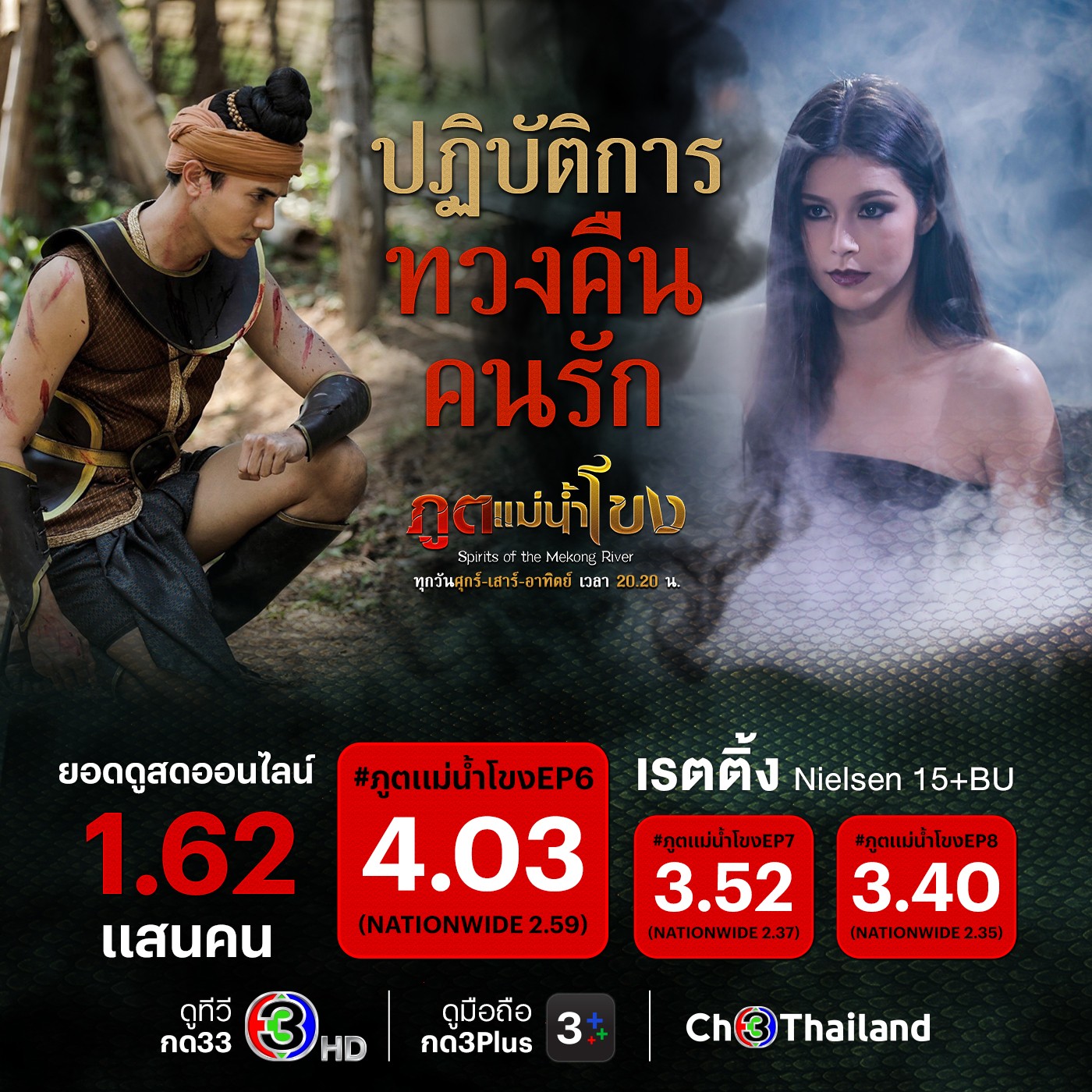 ปมอดีตก็ทวีความเข้มข้นไม่หยุด จนตอนนี้คนดูตั้งตารอชมว่าในอดีตชาติเกิดอะไรขึ้นกับความรักชวนซึ้งระหว่าง ขุนแสนเมือง (ไม้ วฤธ) กับ อัญญานางทอหูก และทำไมปัจจุบัน หมออัคนี ถึงรัก บัวผัน คนที่อดีตเคยร้ายใส่ อัญญานางทอหูก เพราะอยากแย่ง ขุนแสนเมือง แถมล่าสุดเปิดตัวละครใหม่ หมอผีหล่อที่มาพร้อมความโลภ อาจารย์เสาร์ แสดงโดย “ปอม ภาสกร” ที่จะมาปราบผีปอบเคน งานนี้ต้องตามลุ้นกันว่า เคน (แชมป์ ชนาธิป) จะหายจากการเป็นปอบหรือไม่ และอาจารย์เสาร์จะทำอะไรในหมู่บ้านนางคอยแห่งนี้อีก เขาจะรอดพ้นจากอำนาจเจ้าแม่ทอหูกหรือไม่ ส่วน บุญเรือน ที่สูญเสียการมองเห็นดันมองเห็นสิ่งลี้ลับที่คนอื่นไม่เห็น จะเป็นอย่างไรต่อไป ต้องรอชมในละคร “ภูตแม่น้ำโขง” รับชมได้ทุกวันศุกร์ เสาร์ อาทิตย์ เวลา 20.20 น. ทางช่อง 3 ดูทีวีกด 33 ดูมือถือกด 3Plus และดูย้อนหลังครบทุก EP. รวมถึงไฮไลท์และเบื้องหลังฉากหลุด แบบฟินจัดเต็มได้ที่ https://ch3plus.com/drama/1352