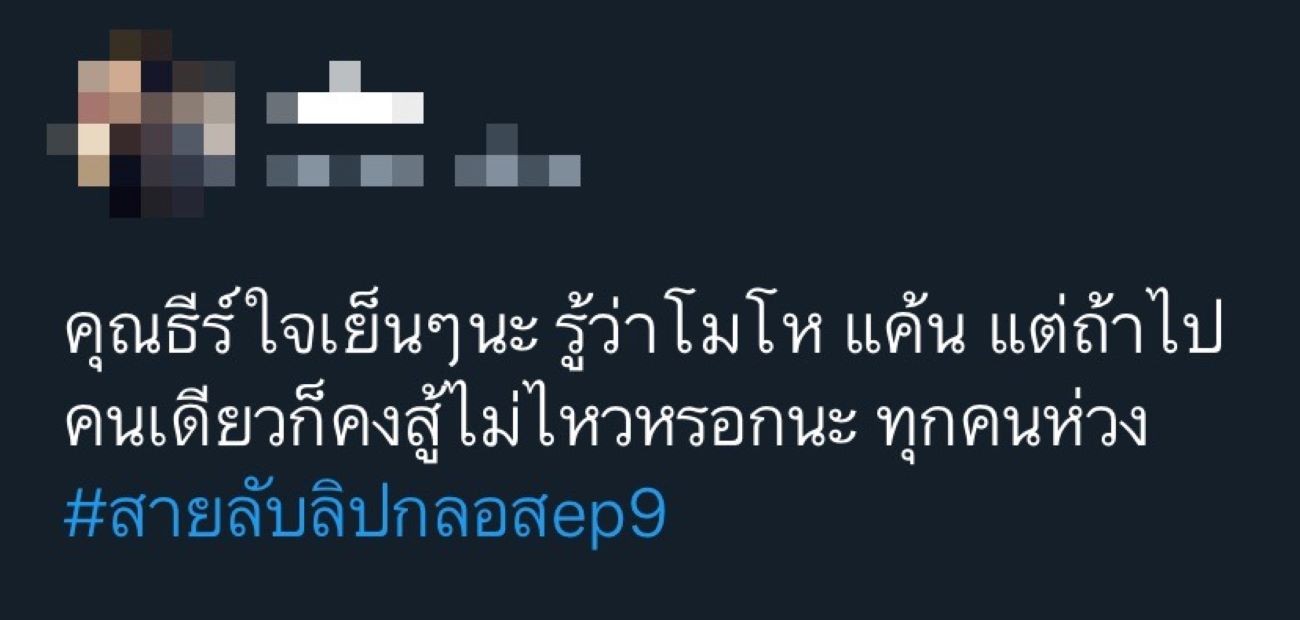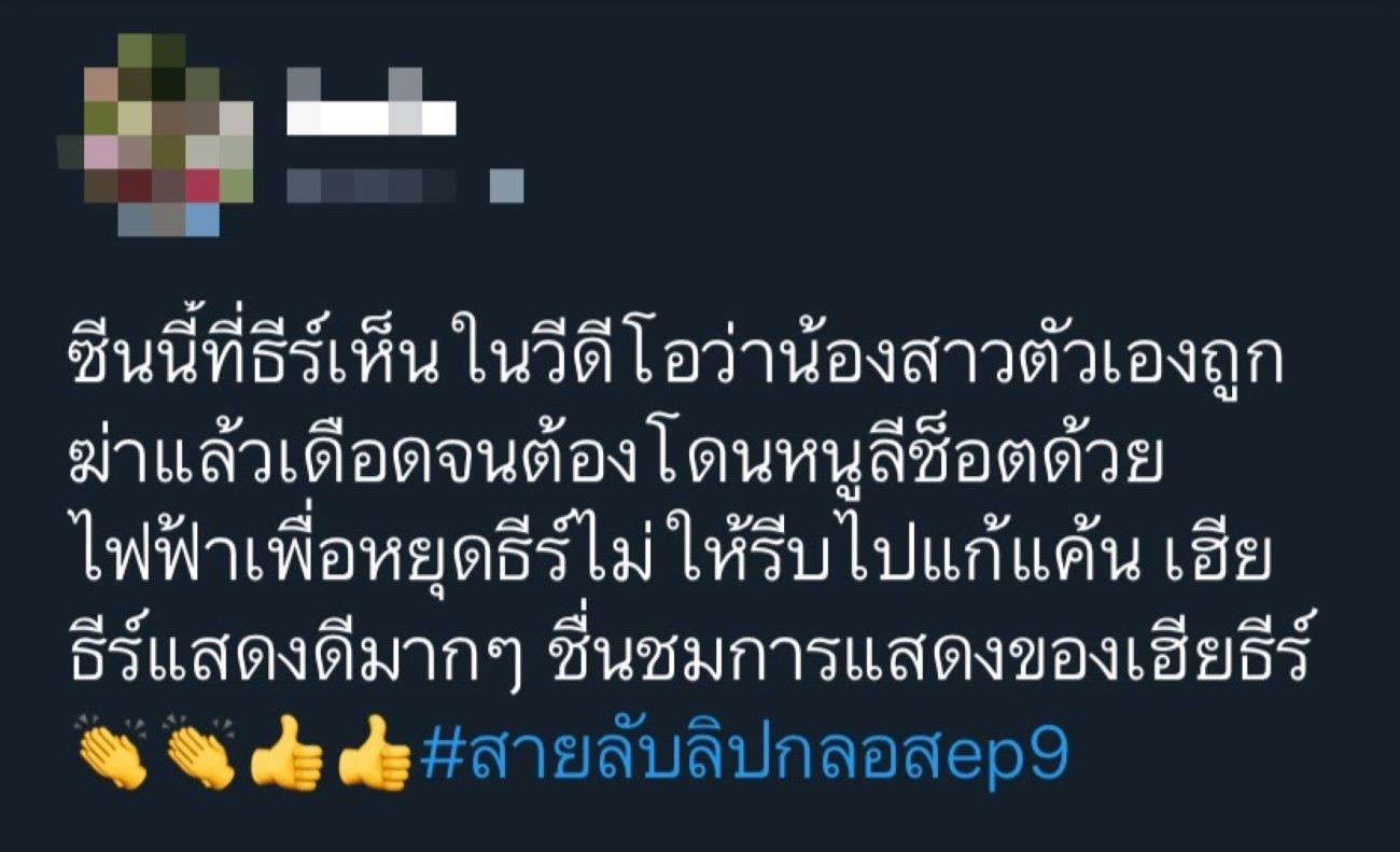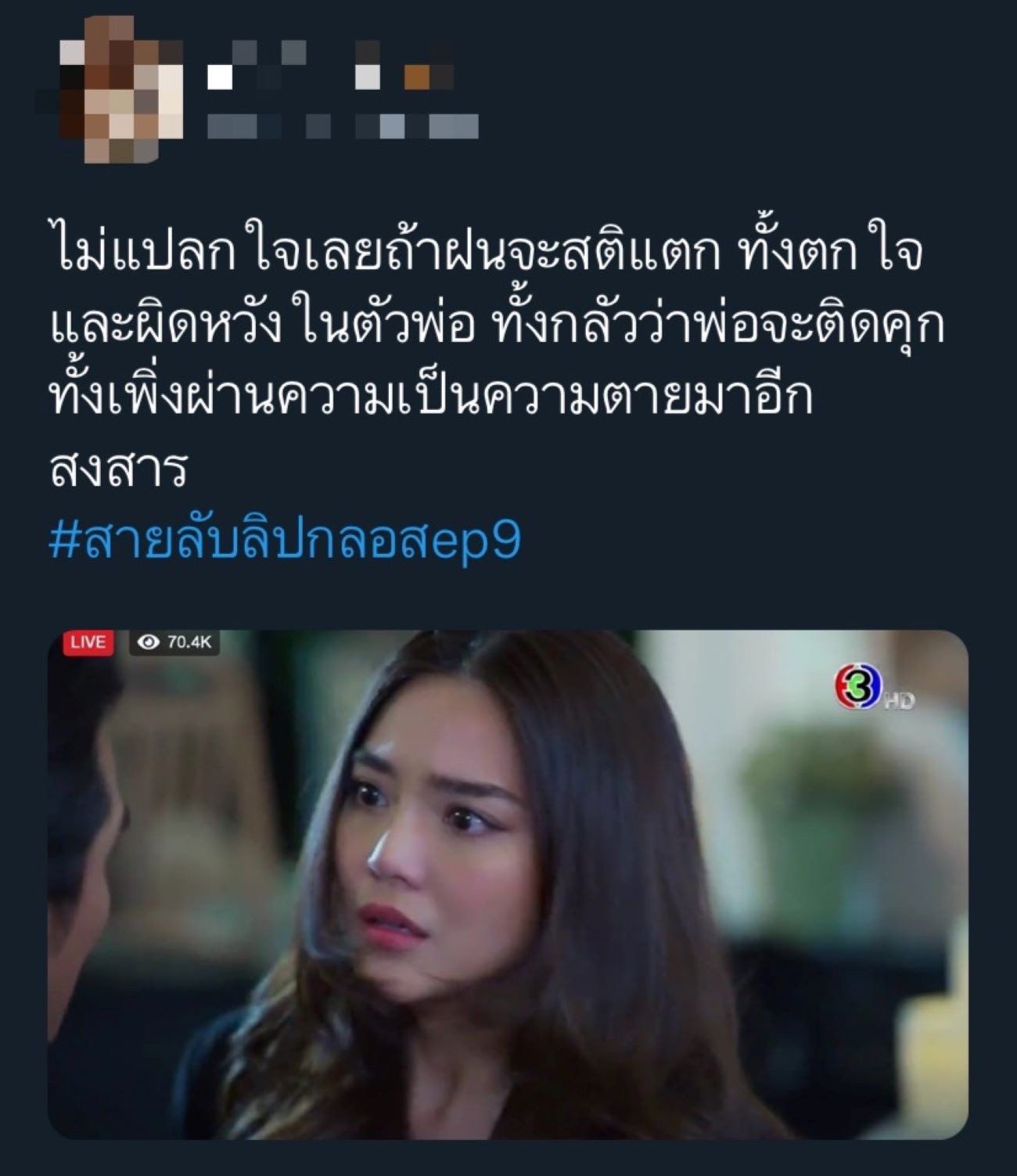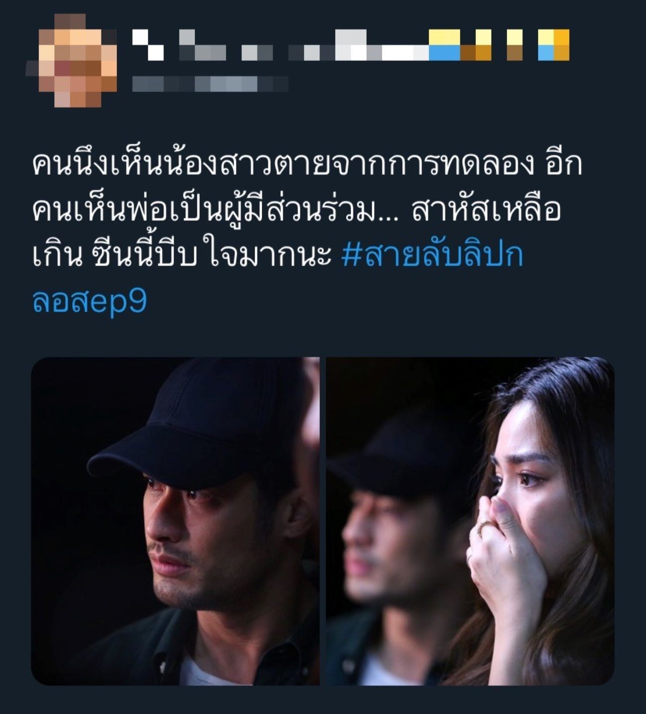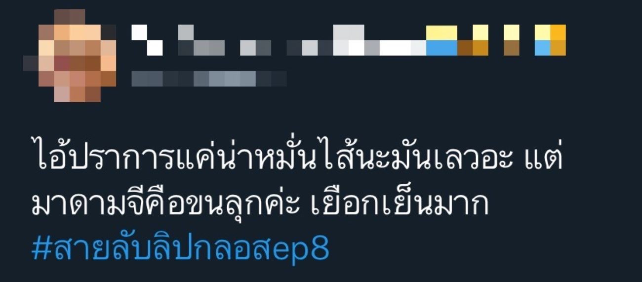 EP. 7-9 “สายลับลิปกลอส” จะทำคนดูอินกันหนักขนาดไหนก็ดูจากคอมเมนต์ในโซเชียลได้เลย อาทิ “เลวกว่าที่คิดไว้เยอะเลยนะครับ ปราการ, คนหนึ่งเห็นน้องสาวตายจากการทดลอง อีกคนเห็นพ่อเป็นผู้มีส่วนร่วม สาหัสเหลือเกิน ซีนนี้บีบใจมากนะ, คุณธีร์ใจเย็น ๆ นะ รู้ว่าโมโห แค้น แต่ถ้าไปคนเดียวก็คงสู้ไม่ไหวหรอกนะ ทุกคนเป็นห่วง, ซีนนี้ที่ธีร์เห็นในวีดีโอว่าน้องสาวตัวเองถูกฆ่าแล้วเดือดจนต้องโดนหนูลีช็อตด้วยไฟฟ้าเพื่อหยุดธีร์ไม่ให้รีบไปแก้แค้น เฮียธีร์แสดงดีมาก ๆ ชื่นชมการแสดงของเฮียธีร์, ไม่แปลกใจเลยถ้าฝนจะสติแตก ทั้งตกใจและผิดหวังในตัวพ่อ ทั้งกลัวว่าพ่อจะติดคุก ทั้งเพิ่งผ่านความเป็นความตายมาอีก สงสาร, ลุ้นมาก ต่อไปพีคขึ้นเรื่อย ๆ, ไอ้ปราการแค่น่าหมั่นไส้นะ มันเลวอะ แต่มาดามจีคือขนลุก เยือกเย็นมาก, รอลุ้นใครคือนายใหญ่”