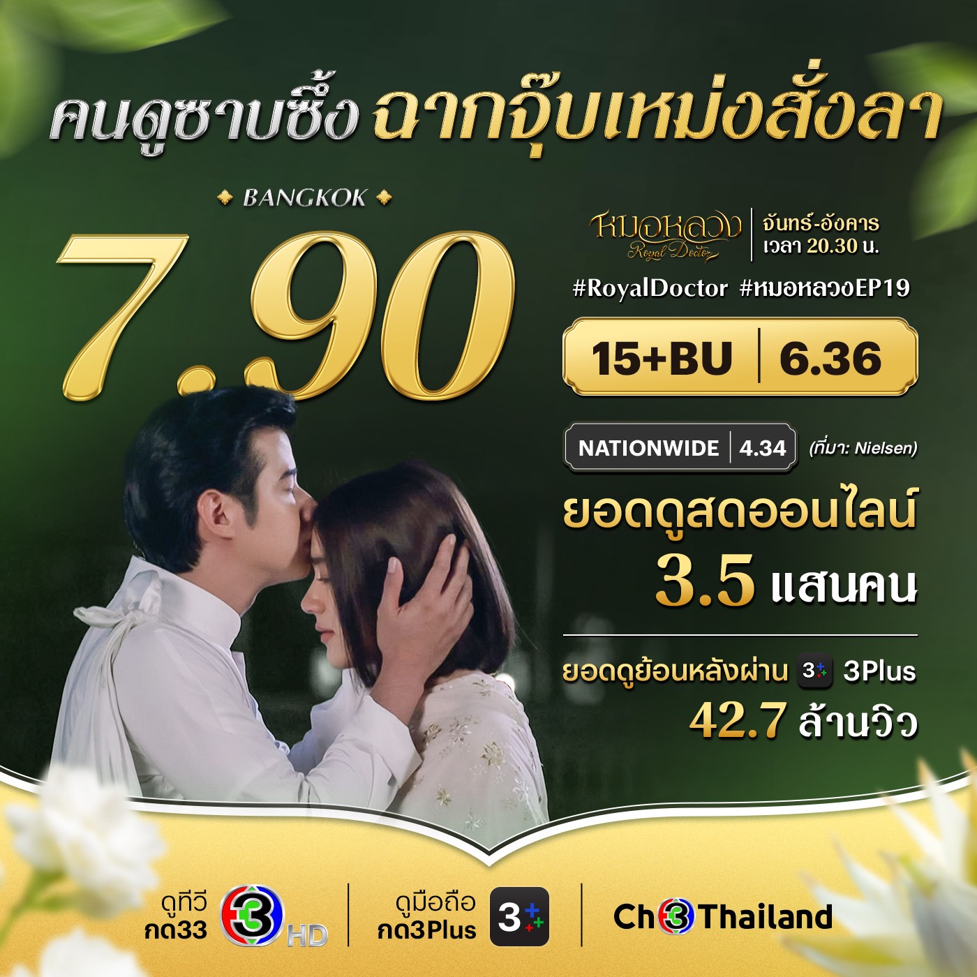 เรื่องราวเข้มข้นทุกวินาที แถมมีเรื่องให้ลุ้นให้ซึ้งกินใจทุกซีน ไม่แปลกใจเลยที่จะครองเรตติ้งอันดับ 1 ทุกอีพี ล่าสุด “หมอหลวง EP. 19” 15+ BU คว้าไปได้ 6.36 เรตติ้ง Bangkok สูงปรี๊ดถึง 7.90 และเรตติ้ง NATIONWIDE ทำได้ 4.34