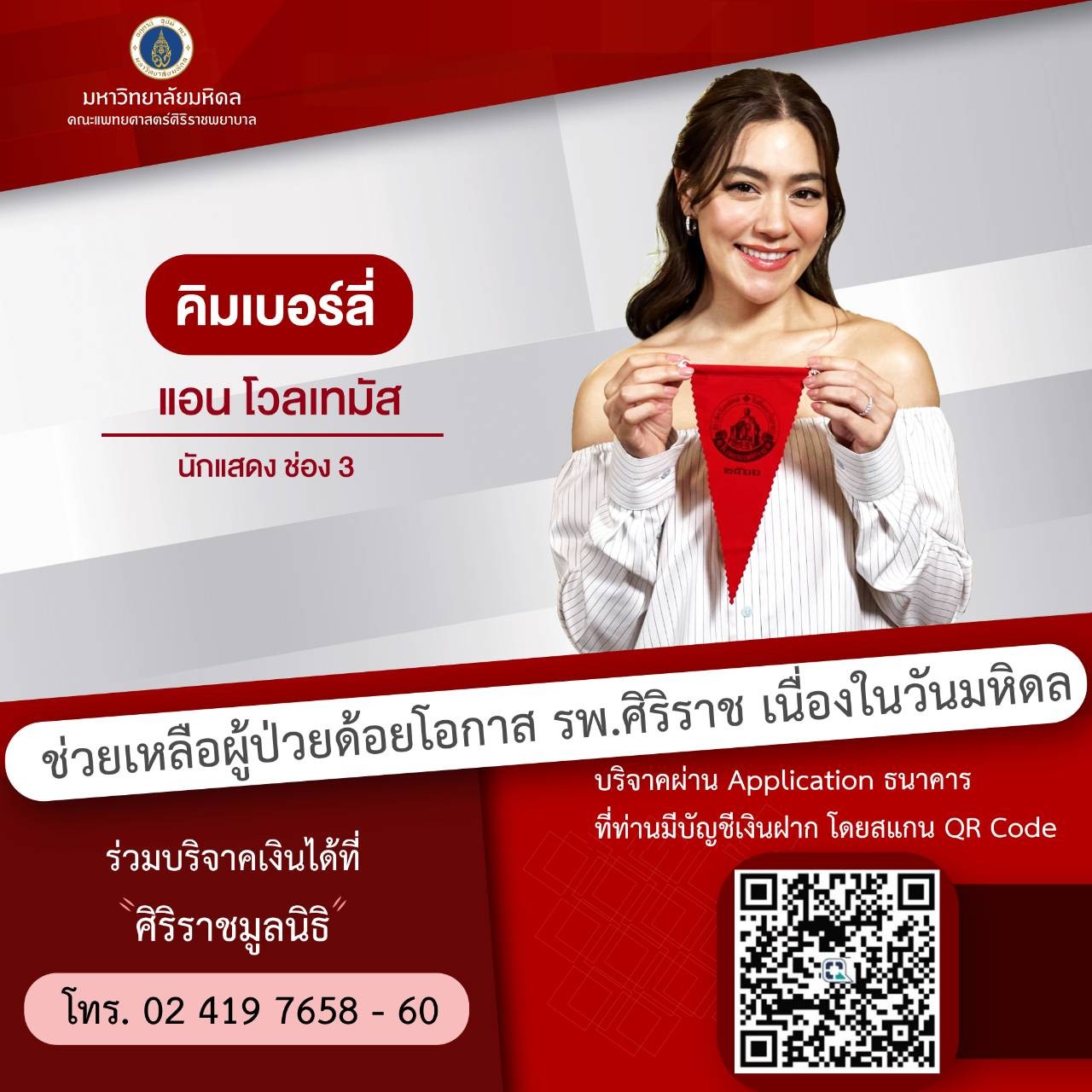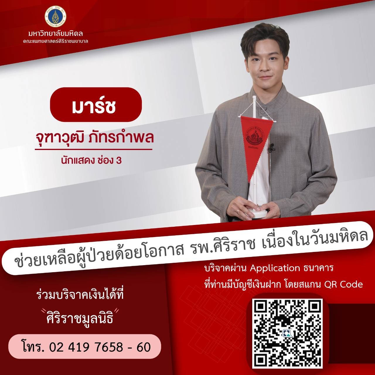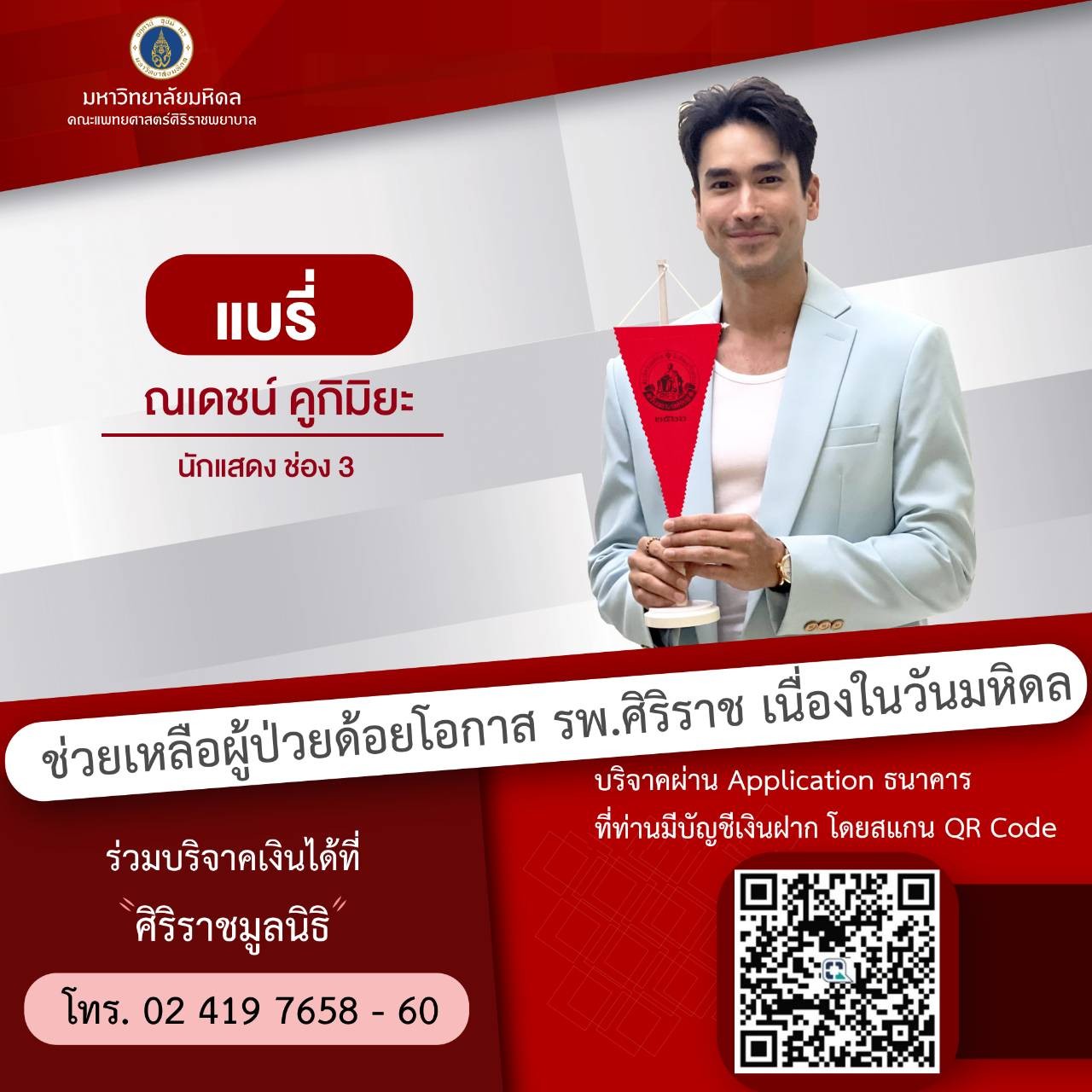 “ณเดชน์ คูกิมิยะ – คิมเบอร์ลี่ แอน โวลเทมัส” พร้อมนักแสดงนักแสดงช่อง 3 อาทิ น้ำตาล พิจักขณา - ลีน่า ลลินา - มาร์ช จุฑาวุฒิ - เพ็ชร ฐกฤต – ป๊อป ธัชทรเชิญชวนร่วมบริจาคเพื่อรับธงที่ระลึกเนื่องใน “วันมหิดล” ซึ่งเป็นวันคล้ายวันสวรรคตของสมเด็จพระมหิตลาธิเบศร อดุลยเดชวิกรม พระบรมราชชนก “พระบิดาแห่งการแพทย์แผนปัจจุบันของไทย” ผู้ทรงอุทิศพระองค์ตลอดพระชนม์ชีพ เป็นแบบอย่างในการ “ให้” อย่างแท้จริง โดยทรงวางรากฐานการพัฒนาด้านการแพทย์และการสาธารณสุขไทย ให้เจริญก้าวหน้าทัดเทียมนานาอารยประเทศ ด้วยสำนึกในพระมหากรุณาธิคุณ คณะแพทยศาสตร์ศิริราชพยาบาลได้จัดกิจกรรมวันมหิดลขึ้นเป็นประจำทุกปี เพื่อเฉลิมพระเกียรติและรณรงค์หารายได้ช่วยผู้ป่วยด้อยโอกาส โรงพยาบาลศิริราช