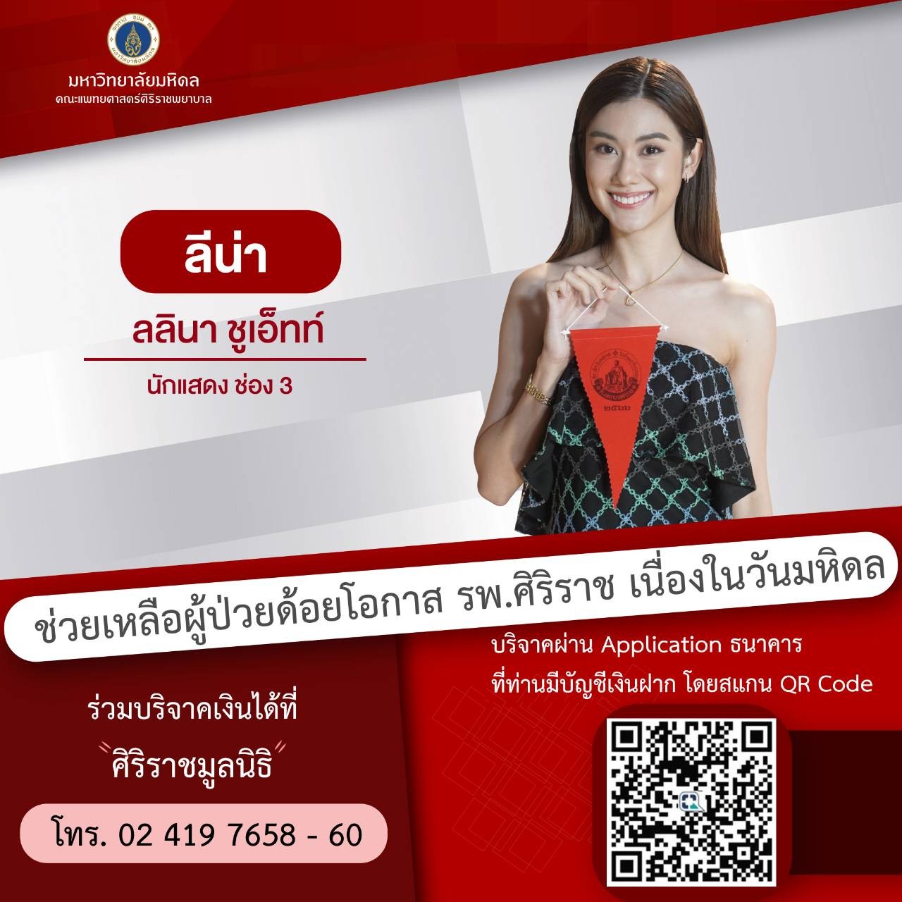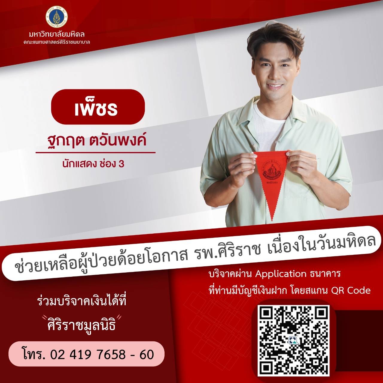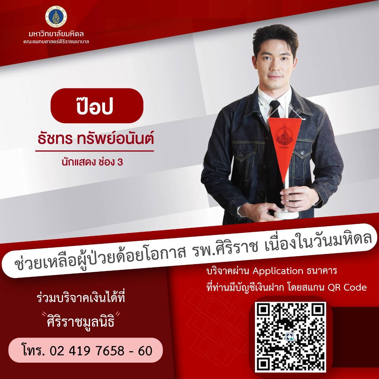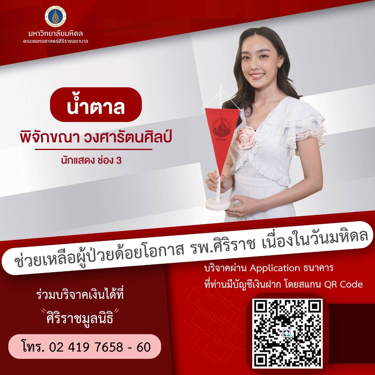 “ณเดชน์ คูกิมิยะ – คิมเบอร์ลี่ แอน โวลเทมัส” พร้อมนักแสดงนักแสดงช่อง 3 อาทิ น้ำตาล พิจักขณา - ลีน่า ลลินา - มาร์ช จุฑาวุฒิ - เพ็ชร ฐกฤต – ป๊อป ธัชทรเชิญชวนร่วมบริจาคเพื่อรับธงที่ระลึกเนื่องใน “วันมหิดล” ซึ่งเป็นวันคล้ายวันสวรรคตของสมเด็จพระมหิตลาธิเบศร อดุลยเดชวิกรม พระบรมราชชนก “พระบิดาแห่งการแพทย์แผนปัจจุบันของไทย” ผู้ทรงอุทิศพระองค์ตลอดพระชนม์ชีพ เป็นแบบอย่างในการ “ให้” อย่างแท้จริง โดยทรงวางรากฐานการพัฒนาด้านการแพทย์และการสาธารณสุขไทย ให้เจริญก้าวหน้าทัดเทียมนานาอารยประเทศ ด้วยสำนึกในพระมหากรุณาธิคุณ คณะแพทยศาสตร์ศิริราชพยาบาลได้จัดกิจกรรมวันมหิดลขึ้นเป็นประจำทุกปี เพื่อเฉลิมพระเกียรติและรณรงค์หารายได้ช่วยผู้ป่วยด้อยโอกาส โรงพยาบาลศิริราช
