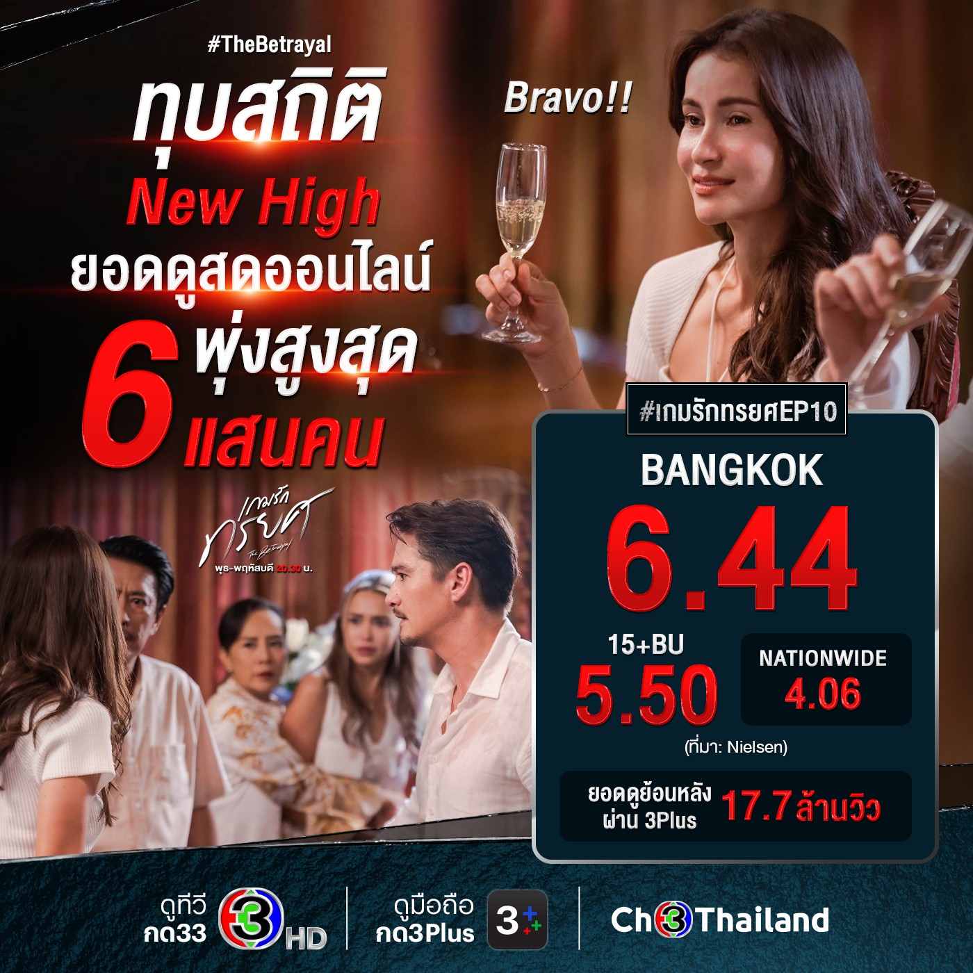 กระแสมาแรงสุดเบอร์แบบนี้ ตัวเลขเรตติ้งจะน้อยหน้าได้ยังไง อีพี 10 ทุบเรตติ้งนิวไฮยืน 1 ไม่แพ้ใคร กลุ่มผู้ชมกรุงเทพฯ ทุบสถิติสูงสุดถึง 6.44 กลุ่มผู้ชมอายุ 15 ปี ขึ้นไป หรือกลุ่ม 15 BU+ (Bangkok and Urban) ฟาดได้ 5.50 เรตติ้งรวมทั่วประเทศ (Nationwide) คว้า 4.06 และในส่วนของยอดดูสดออนไลน์พุ่งแรงสูงสุด 6 แสนคน
